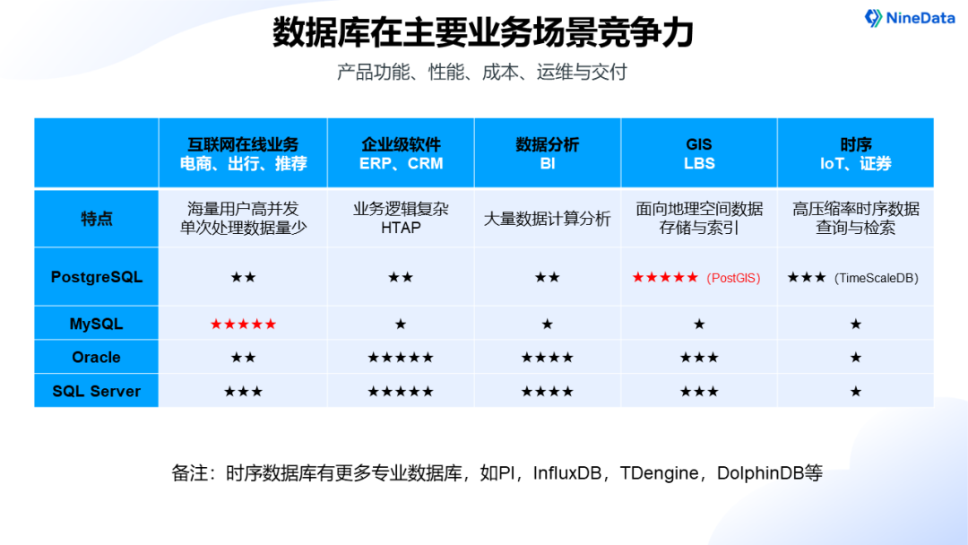 从产品功能分析,虽然MySQL没有PostgreSQL功能强大,但是MySQL基于线程模型+读写分离方案,在早期互联网兴起时LAMP(Linux+Apache+MySQL+PHP)是非常流行的解决方案。早期(2000~2010)MySQL更多使用在新闻、论坛等互联网场景,随着InnoDB存储引擎的成熟,MySQL在事务处理方面也全面增强,开始在互联网交易领域全面开花,如阿里巴巴使用MySQL全面完成了去IOE,京东、携程也从Oracle/SQLServer转到了分布式MySQL架构。PostgreSQL因为是进程模型,与PHP这类没有内置连接池的语言较难配合,在高并发的互联网场景不如MySQL有扩展优势,并且大型互联网公司在分库分表后SQL语句普遍较简单,PostgreSQL不能体现出竞争力。