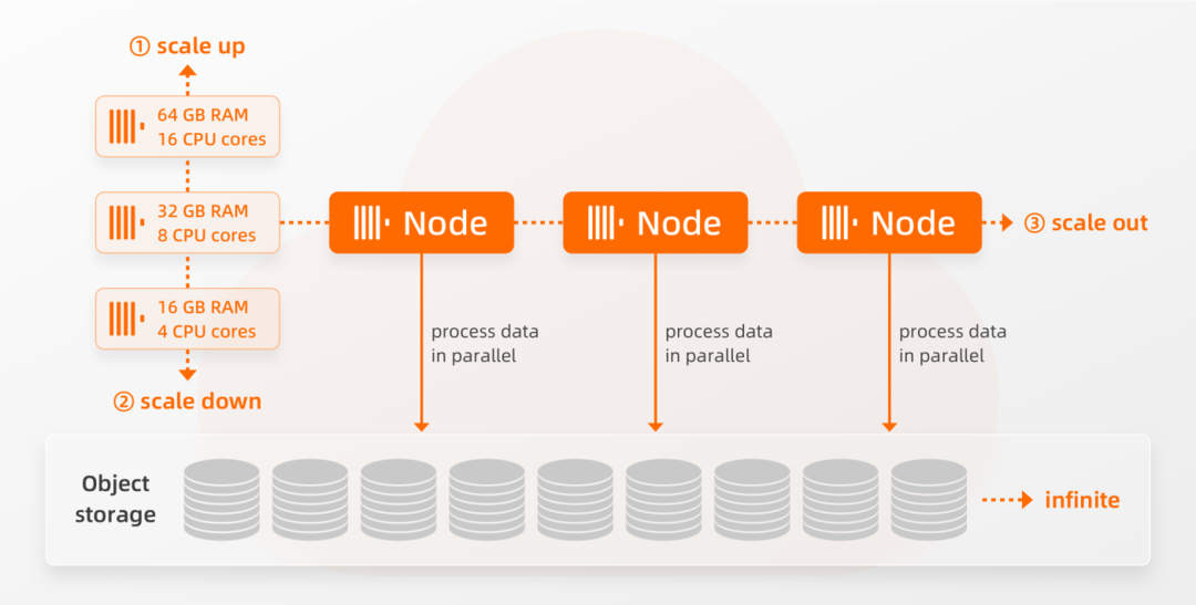 与开源版本使用分片来扩展集群不同,ClickHouse企业版让用户通过简单地增加计算节点的规格和数量来增加 INSERT和SELECT的并行处理能力。请注意,ClickHouse企业版计算节点实际上是单分片的多个副本。这些节点不是包含相同数据的本地副本节点,而是可以访问存储在对象存储中全量相同的数据的无状态差异节点。计算节点规格和数量可以适应工作负载,进行对应的升降配和水平扩缩容,具体步骤描述如下图所示:通过①垂直升配操作和②垂直缩容操作,我们可以更改节点的规格(CPU和内存)。而通过③水平扩展,我们可以增加计算节点的数量。而无需进行任何物理Resharding或数据的Rebalancing,我们可以自由地添加或删除节点。这种无数据移动和搬迁支持水平集群扩展方法,就需要ClickHouse企业版能够提供支持节点访问相同共享数据的表引擎。
