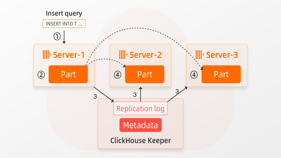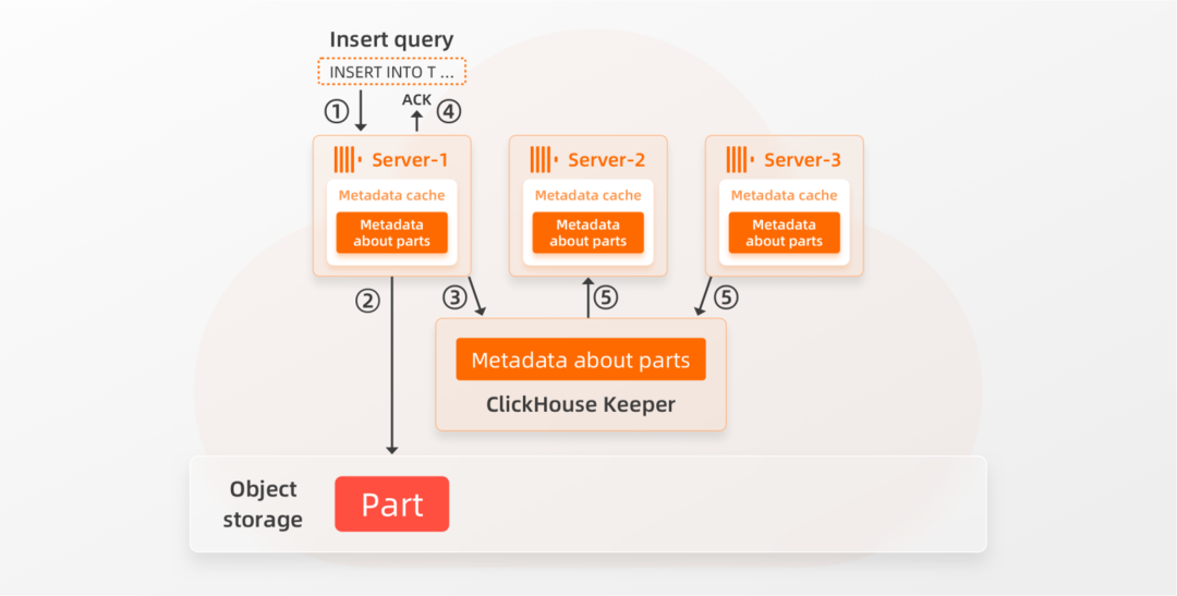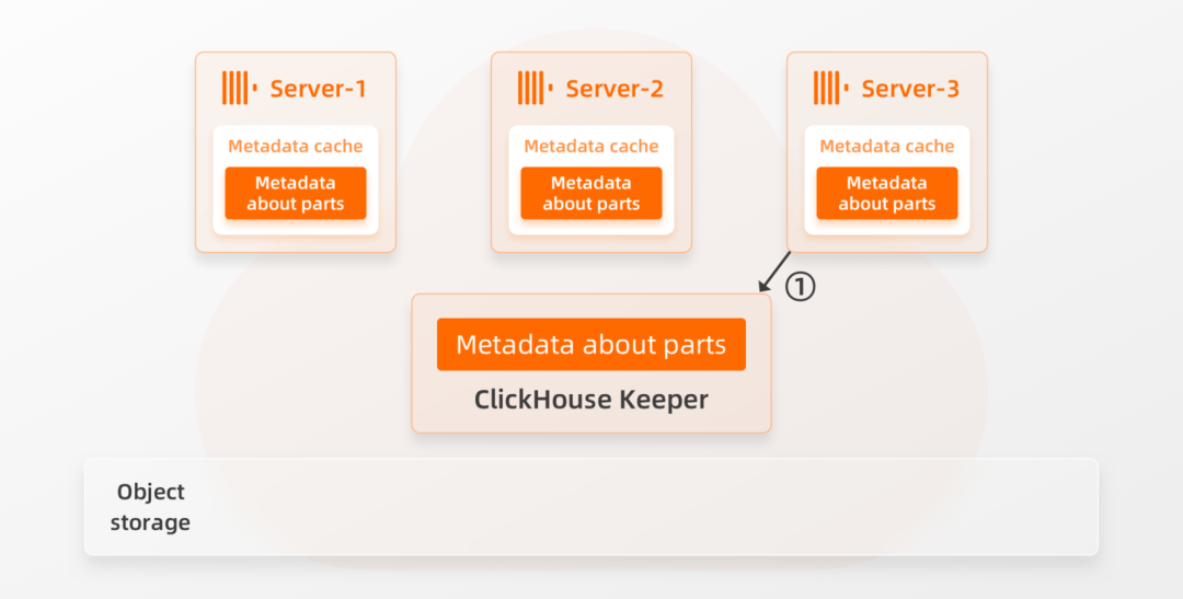 ③ Server-1还将关于该部分的信息存储在其本地缓存和Keeper中(例如,哪些文件属于该Part,以及与文件对应的块位于共享存储中的位置)。
