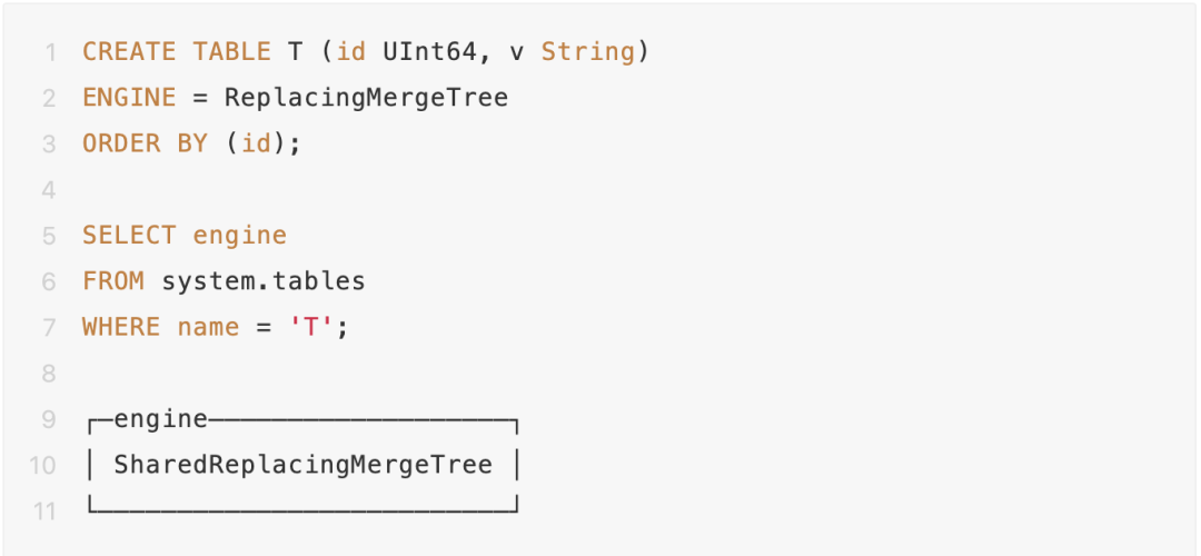 这对于ClickHouse中的其他新功能具有积极的影响,例如SharedMergeTree为Lightweight Update提供了性能提升。同样地,特定引擎的数据转换(AggregatingMergeTree的聚合,ReplacingMergeTree的去重等)也受益于 SharedMergeTree能够提供更好的合并吞吐量。这些转换在后台Parts合并过程中逐步应用。为了确保查询结果的正确性,用户需要在查询时通过使用FINAL修饰符或使用带有显式GROUP BY子句来合并还未合并的数据。在这两种情况下,更高的合并吞吐量都会加速查询的执行速度。因为此时查询所需要进行的数据合并工作较少。SharedMergeTree表引擎现在已经作为ClickHouse企业版中默认的表引擎。ClickHouse企业版支持的MergeTree家族中的所有特殊表引擎,并都会自动基于 SharedMergeTree进行更新。例如,当您创建ReplacingMergeTree表时,ClickHouse企业版将在后台自动创建一个SharedReplacingMergeTree表:在本节中,我们将展示SharedMergeTree的无缝写入性能扩展能力。