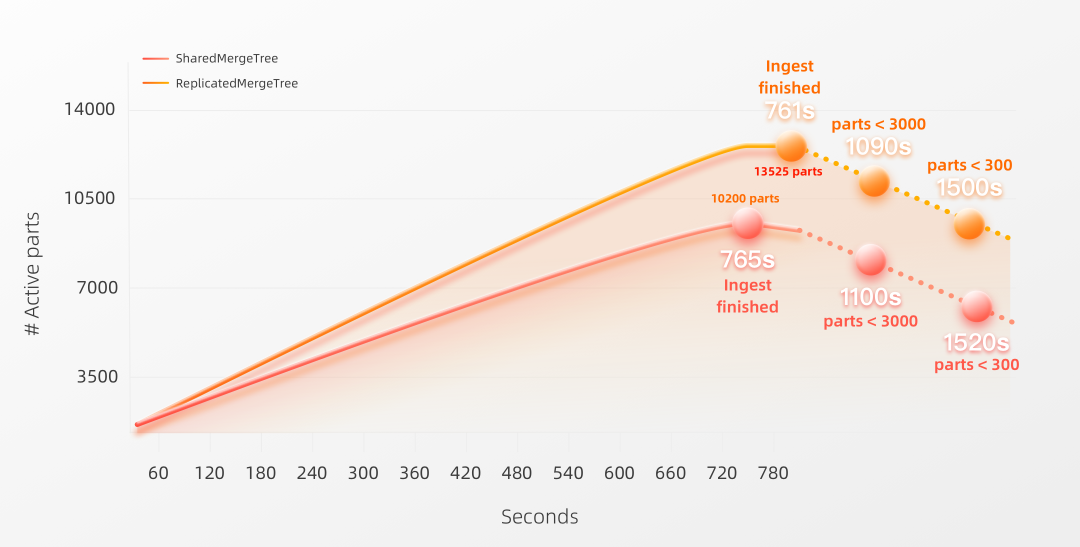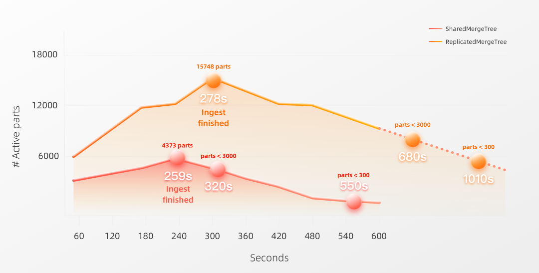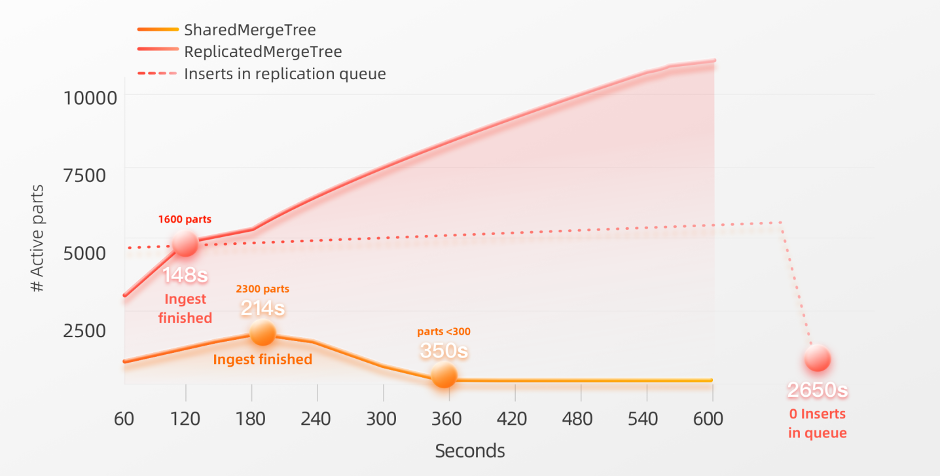 下图可视化了在具有3个副本节点的集群上进行基准测试,期间活动Parts的数量,成功加载数据所花费的秒数(见Ingest finished标记),以及在将Parts合并到少于3000 和 300 个活动Parts时所花费的秒数:我们可以看到两种表引擎的性能在这里非常相似。