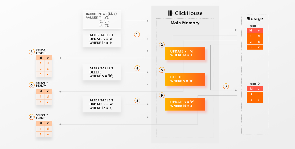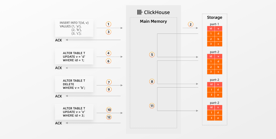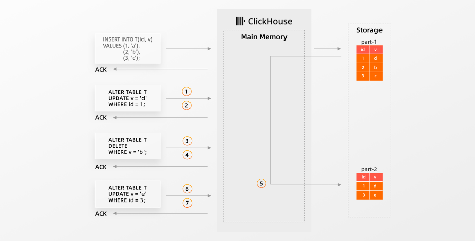当ClickHouse ①接收到更新操作时,更新会被添加到队列中并异步执行,②更新查询立即获得更新的确认。