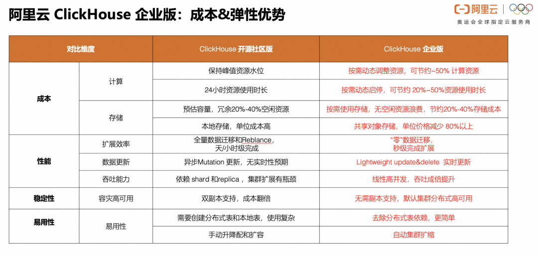 ClickHouse企业版在成本、性能、稳定性上对比开源社区版都有极大的提升,具体对比如下:
