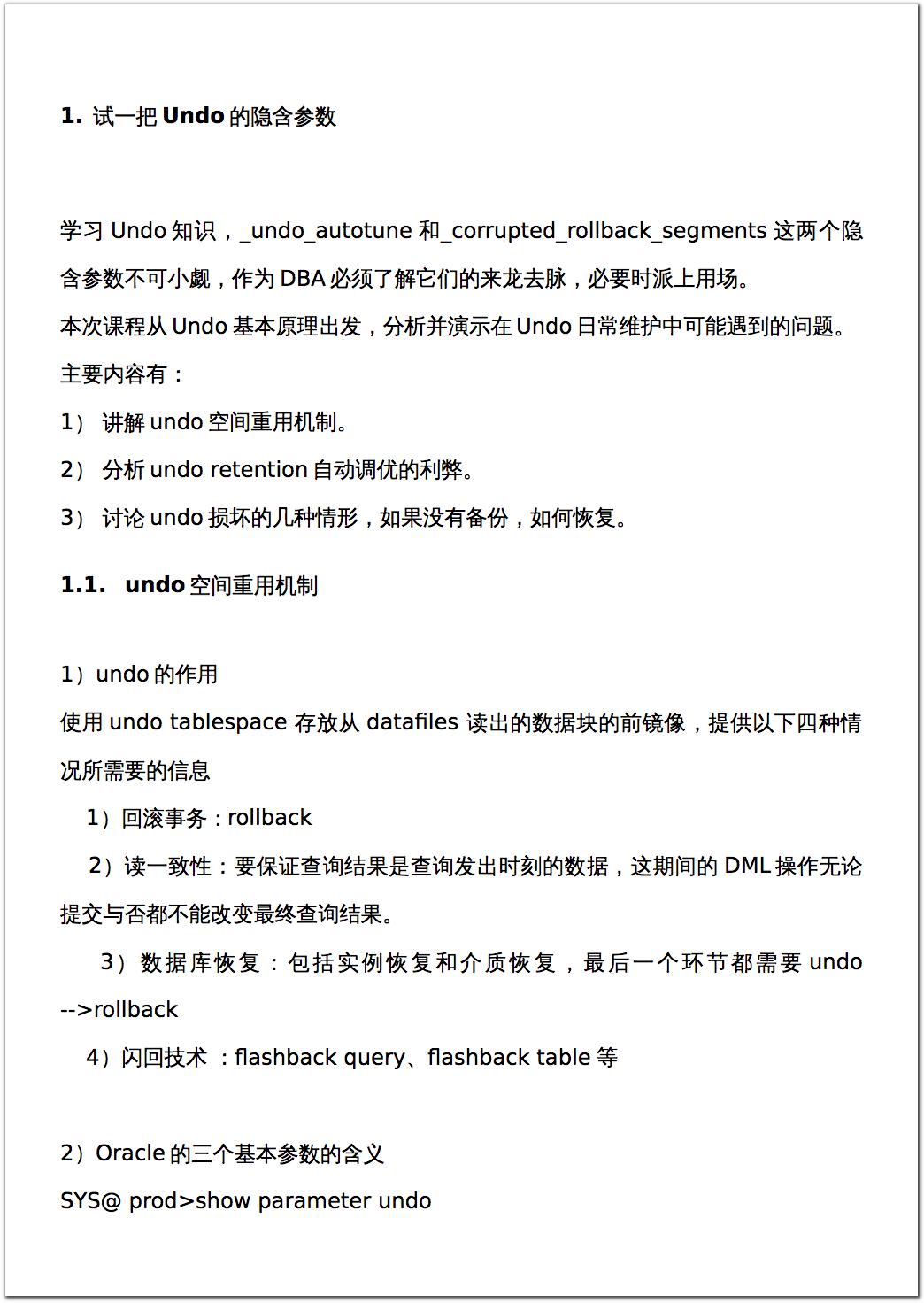 本文档为墨天轮用户上传的《Oracle数据库常用大型操作集合技术总结》,内含undo知识学习、行专列、备份与恢复、Oracle 数据库闪回技术等四章节,全文共189页。