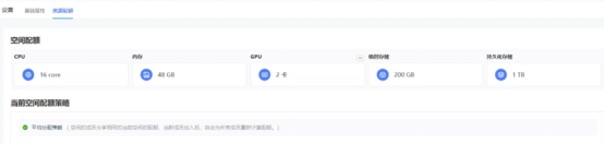 注册后可在“设置”->"资源配额"处查看当前厂家分配的计算和存储资源:我在账户看到的是16核CPU、48GB内存、2卡GPU