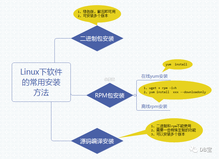 PG安装方法很多,和MySQL类似,给用户提供很大的选择空间。如:RPM包安装(在线、离线)、源码编译安装、系统自带、二进制、NDB安装等。