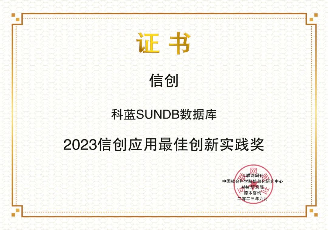 9月20日,由中国科学院《互联网周刊》、中国社会科学院信息化研究中心、eNet研究院、德本咨询联合主办的2023第二十一届中国互联网经济论坛“2023中国新科技100强榜单暨秋季金i奖”榜单发布。该奖项旨在关注专精特新、国产软件、信创、工业互联网、数字经济等领域做出突出贡献的企业,科蓝软件凭借完全自研的中国数据库SUNDB在国家关键基础设施领域的大规模应用,荣获2023信创应用最佳创新实践奖。