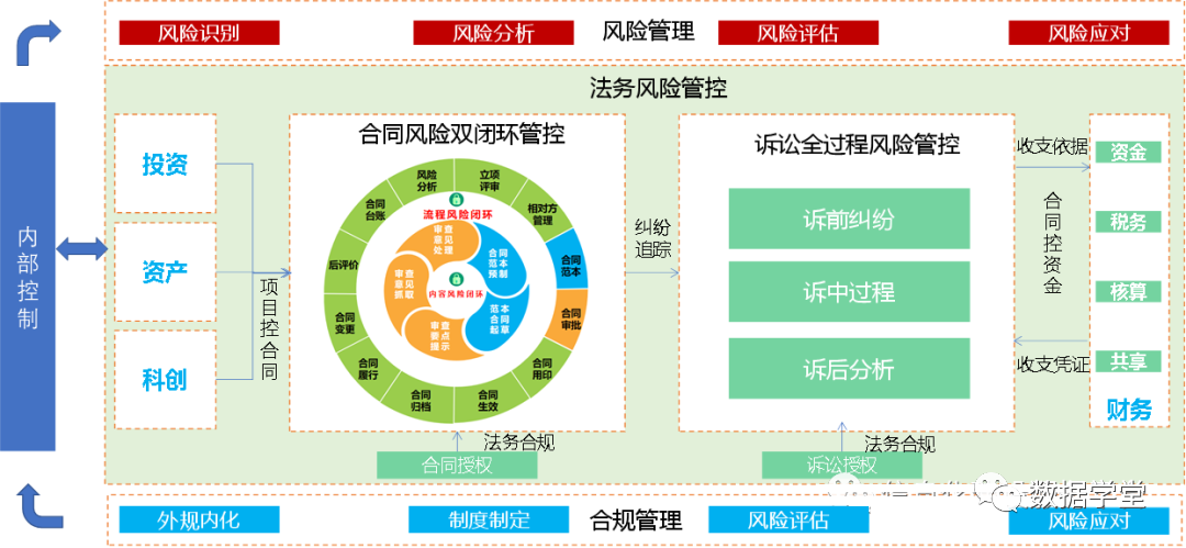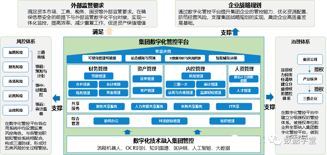 数字化管控平台以数字化技术应用为依托,支撑战略规划核心能力的建设,并满足外部监管的要求,并支撑分级授权和风险管控两个体系,集团、产业板块、三级企业在按照权力和责任清单建立的分级授权管控体系中做到“分权不分散”,并能够对战略风险、财务风险、市场风险、运营风险、法律风险等五类风险进行事前、事中、事后的全过程进行管控。