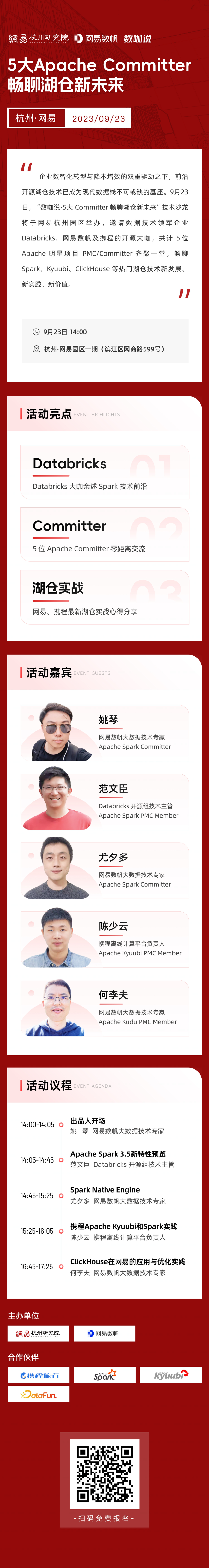 企业数字化转型与降本增效的双重驱动,再次提升了数据技术对于企业发展的意义,而前沿开源湖仓技术成为了现代数据栈不可或缺的基座。未来的数据生产力如何塑造?9月23日,网易杭州研究院、网易数帆将于网易杭州园区举办“数咖说·5大 Committer 畅聊湖仓新未来”技术沙龙,邀请数据技术领域领军企业Databricks、网易数帆及携程的实战大咖襄助,共计 5 位 Apache 明星项目 PMC/Committer齐聚一堂,畅谈 Spark、Kyuubi、ClickHouse 等热门湖仓技术新发展、新实践、新价值。