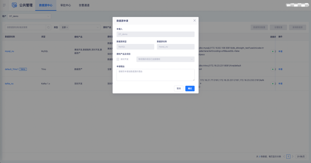 新增功能说明:项目管理员、项目所有者角色可在数据源中心进行数据源的申请,数据源权限经超级管理员、租户所有者、租户管理员审批通过后,引入数据源弹窗才会出现审批通过的数据源,项目管理员和项目所有者可以在项目中引入。