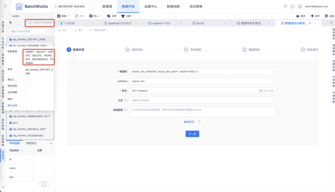 8.表查询中的 GP 数据源,除了显示集群下所有表,还支持仅显示当前用户有权限的表