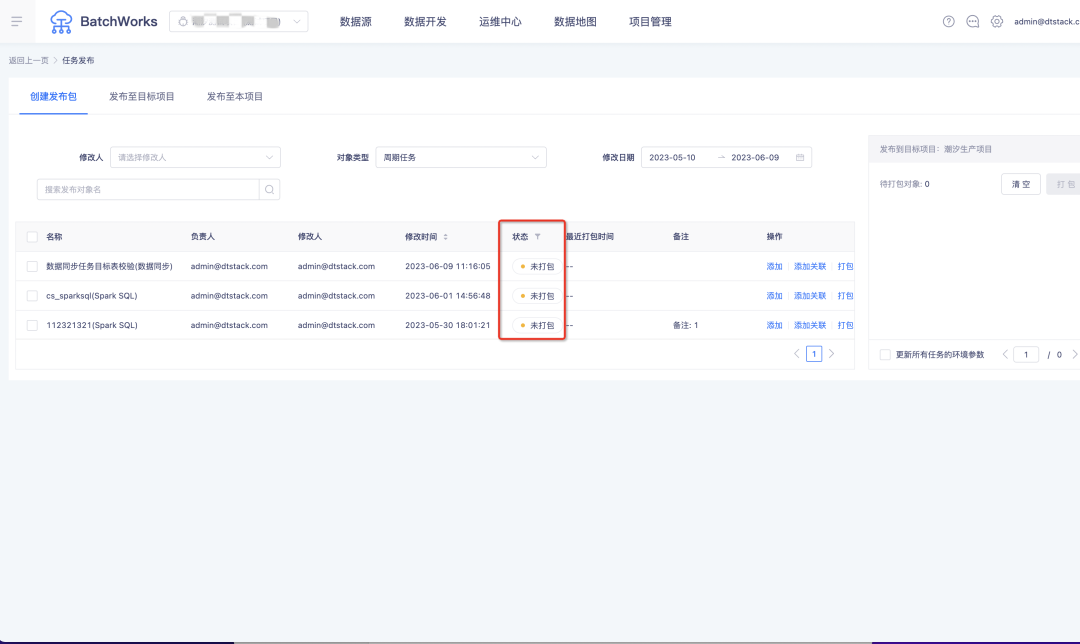 新增功能说明:发布页面增加了「状态」字段,包含「已打包」和「未打包」两种状态,重新提交的「周期任务」「手动任务」等对象,状态会变为「未打包」状态。