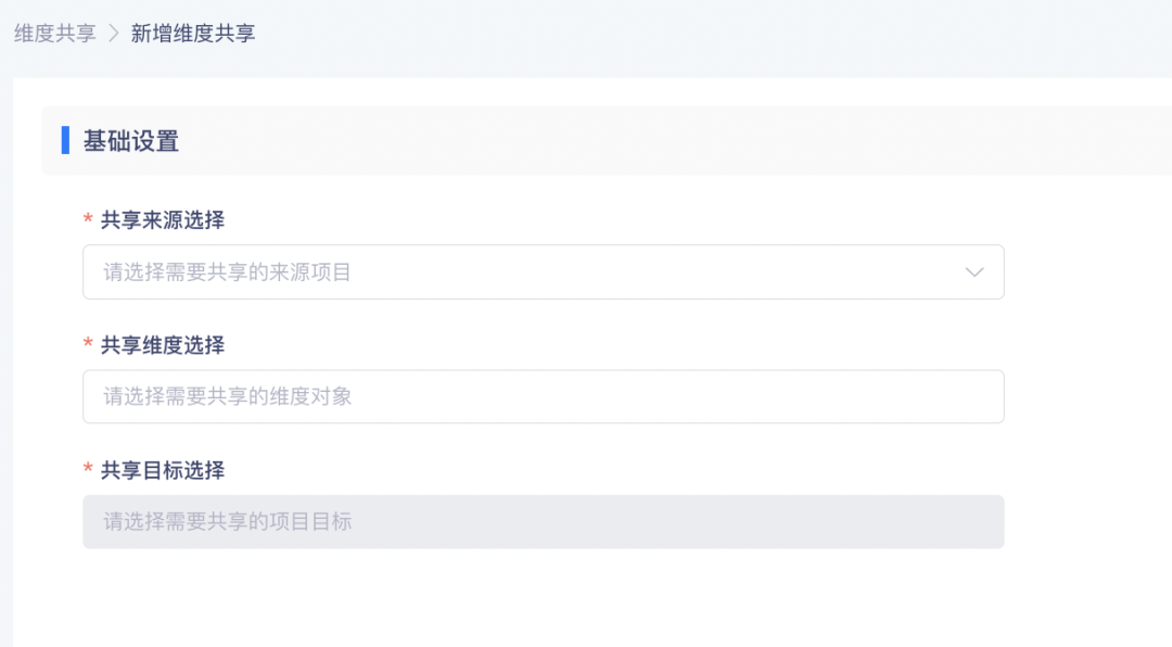 • 点击「新增维度共享」可将指定项目的维度共享给其他项目,整体设置内容与指标共享类似,只需设置基础共享内容即可
