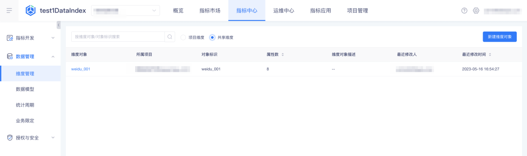 • 共享的维度可在项目内的「指标中心」-「数据管理」-「维度管理」中的「共享维度」tab 查看,模型、自定义指标加工时选择的维度信息可引用共享来的维度