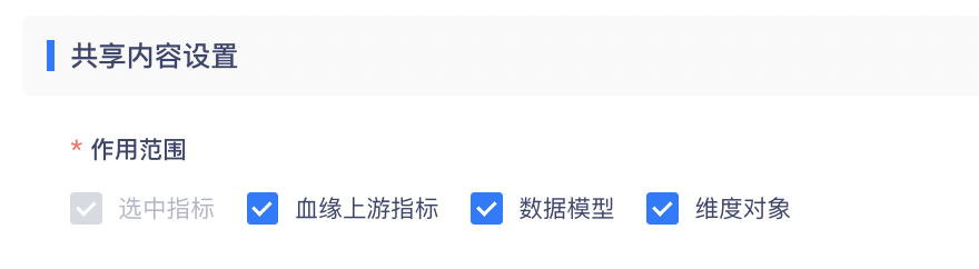 新建指标共享时,【第一步:设置通用共享信息】中的作用范围可增加血缘上游指标、数据模型、维度对象。