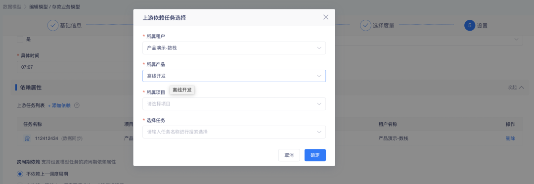 模型、指标调度信息设置中,选择上游任务时,可选择落表模型生成的任务。