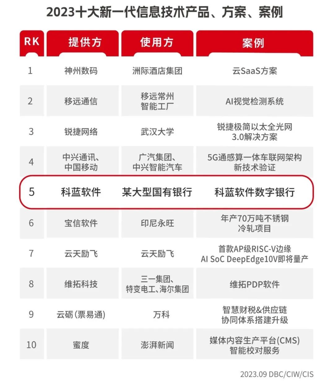 近日,由中国科学院《互联网周刊》、中国社会科学院信息化研究中心、eNet研究院、德本咨询联合发布了“2023十大新一代信息技术产品、方案、案例”榜单,科蓝软件凭借在某大型国有银行实施的数字银行案例荣登该榜单。