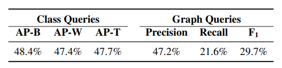 为了衡量端到端的效果,GAIA参加了TAC SMKBP 2019评估,系统根据语料库构建多模态知识图谱,并根据构造的知识图谱中对类查询和图查询的响应情况对系统性能进行了评估,结果如下: