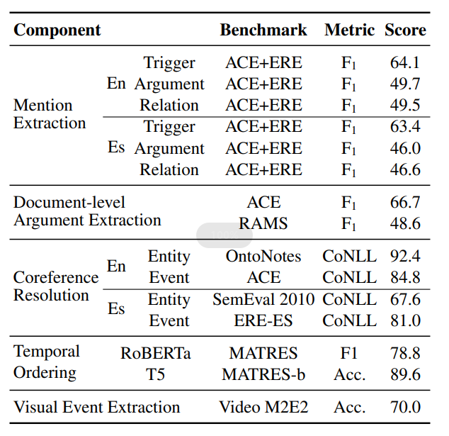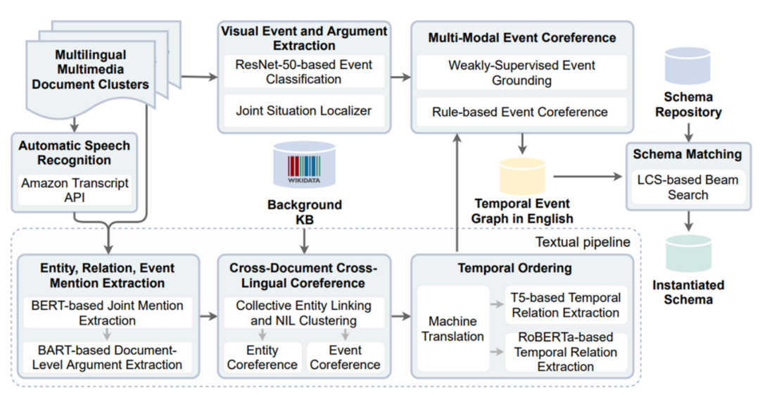 对于多模态文档当中的语音,Resin使用Amazon Transcribe API将其转换为文本,后续当作文本信息处理。使用OneIE对文本进行句子级别的实体、关系、事件联合抽取,然后将实体提及链接到WikiData。由于事件抽取中,很多信息是跨句子的,所以文章还开发了文档级事件抽取模型,并把两个模型的结果合并作为最终输出。
