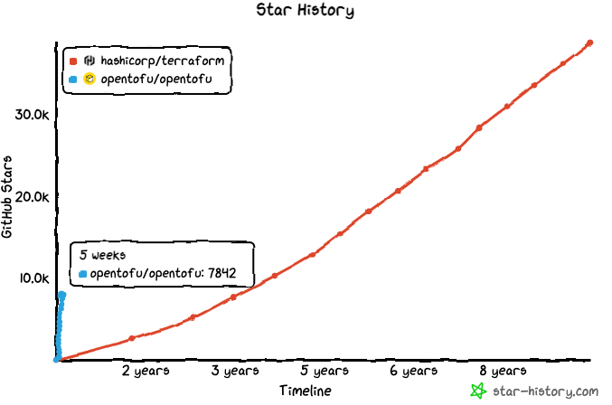 目前势头还是挺旺的,5 周的星星数就堪比 Terraform 3 年多的积累。