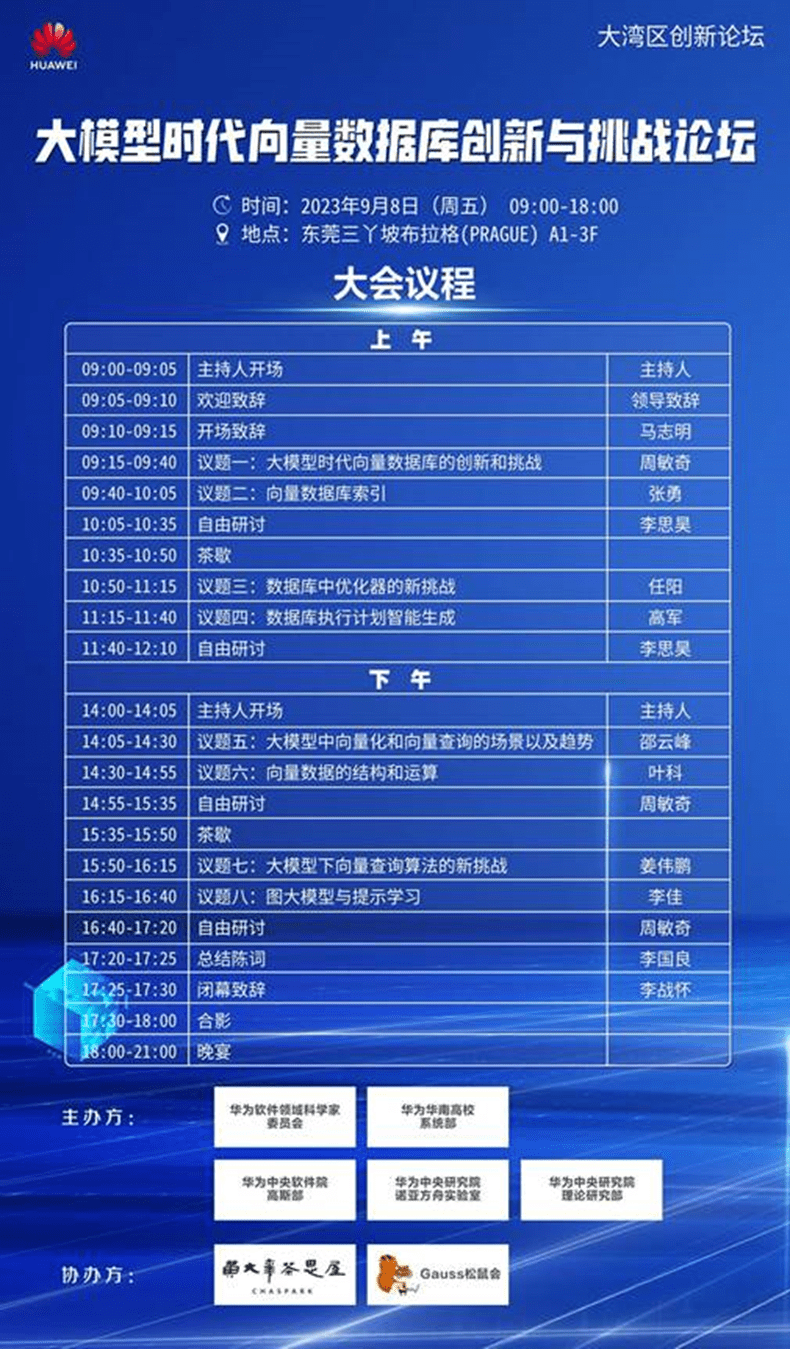 在AI世界中,向量被用于表达物理世界的万物,大模型的兴起,使向量数据的存储和计算需求得以大规模释放。而大模型大规模落地面临实时性、隐私性、上下文长度限制三大挑战,向量数据库在此挑战的解决过程中扮演着关键角色,其未来的演进以及创新路线成为重要研究点。2023年9月8日,“大模型时代向量数据库创新与挑战论坛”在东莞三丫坡圆满落幕。本次活动由华为软件领域科学家委员会、华南高校系统部、中央软件院高斯部、中央研究院诺亚方舟实验室、中央研究院理论研究部联合主办,黄大年茶思屋与Gauss松鼠会协办。论坛邀请了包括中国科学院马志明院士、CCF数据库专委会主任李战怀老师等20多位行业领军人物、产业领袖、专家学者和创新践行者现场参会。同时,20余位华为专家也参加了本次论坛。此外,有200+观众通过黄大年茶思屋等直播渠道线上与会。