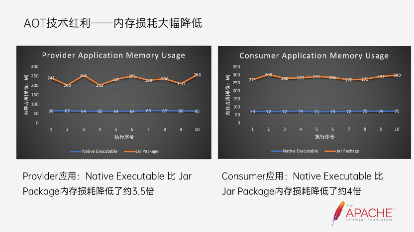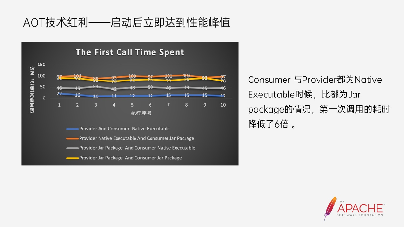 在云计算的时代中,Java 应用存在劣势,最明显的就是在 Serverless 场景。因为 Serverless 除了能够简化应用的开发外,最关键的就是能够做到让开发者的应用服务做的秒级弹性扩容。除了容器调度和新的 Pod 创建的时间损耗以外,镜像下载耗时、应用冷启动耗时、以及应用服务预热所需的耗时,都是影响弹性扩容的因素。上图是 Datadog 统计了 FaaS 产品 AWS lambda 在各语言的使用程度,可以看出来即使 Java 依旧是最流行的编程语言,Java 与 Node.js 和 Python 的差距还是非常明显。Java 语言虽然更流行,但相较于 Python 和 Node.js,它的占比还是比较低的。而面对 Java 语言的这些问题,GraalVM 也是应运而生。这里引用官网对 GraalVM 的介绍,GraalVM 能够提前将 Java 应用程序编译成独立的二进制文件。与在 Java 虚拟机上运行的应用程序相比,这些二进制文件更小,启动速度快 100 倍,在没有预热的情况下提供峰值性能,并且使用更少的内存和 CPU。是不是发现它解决的正是刚刚所提到的所有问题。包括冷启动速度问题、启动后需要预热、内存占用和 CPU 使用率也相对较高,甚至能够降低二进制文件的大小。二进制文件大小的降低更有利于容器镜像大小的缩减,减少镜像下载所需的时间。GraalVM 可以理解为是 OpenJDK 的一个“超集”,它不但包含了完整的 JDK 发行版本,还包含 GraalVM Compiler、Native image、Truffle 等组件, 并且支持多语言混编等能力。这就意味着在使用这些新的能力的同时,Java 应用程序也能够按照原有的形式在 Graalvm 环境下正常的运行。而在这个介绍中我们能够看到一个关键的的技术点,那就是 ahead of time,AOT 技术。传统的 Java 开发中,我们采用的都是 JIT,JIT 即为将我们编写的 Java 源代码编译为 .class 文件,并在运行期间将 JVM 认为是热点的字节码转化为机器码,加快程序运行速度。而 AOT 则是在编译期间就将字节码转化为了机器码,它将不再会有运行期还在持续将热点的字节码转化为机器码的操作。GraalVM 本身就包含了 JIT 和 AOT 这两部分。看左边的这张图,它就是一个标准的 Java 应用完整的生命周期。首先是 JVM 的启动初始化,然后到 Java main 函数的启动和调用,然后是应用预热的阶段,然后才是到达应用稳定运行的阶段,最后是应用销毁,至此整个 Java 应用的生命周期完结。可以看到在 Java 的整个生命周期中,如果是传统的 JIT 模式,从启动到达到应用平稳的阶段,需要经过 JVM 的初始化,类加载,解释器执行、即时编译、GC,并且即使到达了应用的稳定阶段,JIT、解释器依旧还在运行。而对于 GraalVM 中的 AOT 技术而言,首先省去了 JVM 的启动,也就是红色区域的时间,第二是省去看解释器和编译器所占用的时间。那么既然 AOT 这么多优点,是否能替代 JIT,从目前来看还是没有办法替代的,右边这张图就说明了虽然现在 AOT 具备非常客观的启动速度提升,非常低的资源消耗,以及包的大小更小等优点,但是在吞吐量的峰值和最大延迟上还是 JIT 更优一些。当我们编写完程序的源代码后,需要对源码进行编译打包,生成能够启动 Dubbo 应用程序的目标产物,目前还是以第一种 Jar 包的形态居多。而第二种则是引入 Spring Boot 后支持的产物形态,采用 Spring Boot 的插件,能够快速的生成容器镜像,而无需自己写比如 Docker file,手动把 Jar 打包到镜像中。方便了 Dubbo 应用的容器化部署。而第三种则是 Dubbo 支持 GraalVM 后所新增的产物形态:Native Executable。这三种产物的打包命令也有所区别,传统的 Jar 包形态,是最常见的 mvn clean package,第二种则是执行了 SpringBoot 的插件,第三种则是在编译阶段执行了 native 相关的插件。这种新的产物 Native Executable 能够做到无需安装 JDK 环境即可启动应用程序。Dubbo 框架发展有近十年,提供的能力也越来越强大,同时 Dubbo 应用的启动速度一直也是令我们比较头疼的事情,但是随着集成 GraalVM Native Image 后,这个问题也让我们看到了希望。这上面展示了两张图,第一张图描述的是分别在 Native Executable 和 Jar package 的场景下,仅提供一个 Dubbo 服务的应用启动耗时对比。这里的数据都统计与 4c16g 的 macOS 系统下,并且每个场景都跑了 10 组数据。这里的启动耗时也将 JVM 启动耗时考虑进去,比如 Jar package 场景下的耗时计算的是从 java -jar 启动 Java 应用直到应用启动就绪,所需的耗时。从对比图可以看出,Native Executable 比 Jar package 的启动耗时降低了 12.4 倍,也就是启动速度提升了 12.4 倍。第二张图则是仅存在一个 Dubbo 服务 Consumer 的应用启动耗时对比,从对比图可以看出,Native Executable 比 Jar package 的启动快了 11 倍。由此看出集成 GraalVM Native Image 后,Dubbo 应用真正的能够实现毫秒级启动。从统计图表上看,当 Consumer 和 Provider 都为 Native Executable 时,比他两都是 Jar package 的情况第一次调用的耗时足足减少了 6 倍。使 Dubbo 应用能够在启动后立即达到性能巅峰。启动耗时和启动即达到性能巅峰,这两个技术红利也让 Dubbo 有机会拓展在 Serverless 或者说是 Faas 技术场景的应用范围。在这里同样给出了 Provider 与 Consumer 应用在 Native Executable 与 Jar Package 两个场景下的内存对比统计图,拿第一张图,可以看到,Jar Package 启动后,所需的内存是 200 多兆,而 Native Executable 仅占了 60M 左右,在内存损耗上整整降低了 3.5 倍,在如今降本的大环境下,使得我们能够对 Java 应用降低内存使用,节省系统资源充满了更多的想