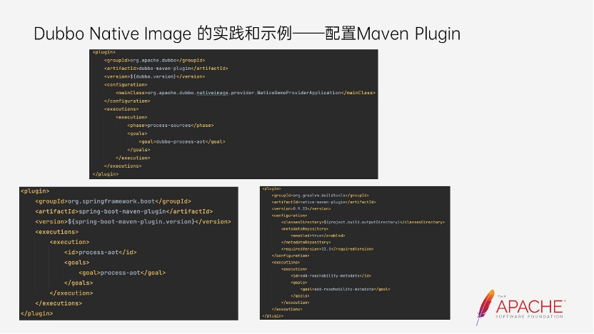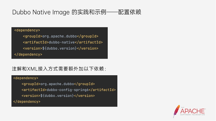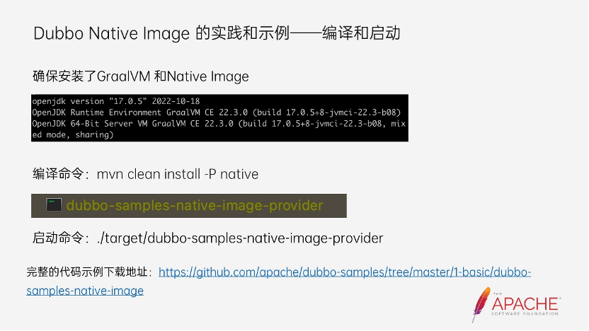 首先需要安装 Dubbo Native Image,这里就不过多介绍了,大家可以根据官方的文档进行下载。然后安装插件,可以看到上图中有三个插件需要安装,但和 Dubbo 相关的只有一个,是 Dubbo Maven Plugin。第一张图就是 Dubbo 新版本提供的用于适配 GraalVM Native Image 的 maven 插件。第二张图则是 SpringBoot 的 maven 插件,用于处理 Spring Boot 的 AOT 处理逻辑。如果采用的是 Dubbo 的 API 接入方式,则无需配置 SpringBoot 的 maven 插件。第三张图则是 GraalVM 官方提供的 maven 插件,它集成了打包编译 Native Executable 的逻辑。接下来是配置所需的依赖,Dubbo 集成 Native 还需要额外配置两个依赖,也就是 dubbo-native 和 dubbo-config-spring6,其中 dubbo-config-spring6 也与前面的 SpringBoot 插件一样,如果不采用 xml 或者注解的方式接入,则无需配置该依赖。它主要用于适配 Spring6,因为目前 Dubbo 还兼容着低版本的 Spring 和 Springboot,并且还兼容着 JDK8 和 JDK11,而 Springboot3.0 和 spring6 以上的版本将最低的 JDK 版本调整为了 JDK17,所以目前使用该模块来适配和兼容高版本的 Spring。dubbo-native 中集成了 dubbo 所有的 source code 和 Reachability Metadata 生成的逻辑。以保证 Dubbo 应用能够正常被编译打包成 Native Executable,并用 Native Executable 形态正常运行。除此上述的配置以外,其他的使用方式都没有任何变化,开发者就可以把一个应用打包成 Native Executable。这里罗列了编译的命令,编译是需要 GraalVM 的环境和 native-image 工具,所以在编译前先检查环境是否正常。编译完后,在工程的根目录下就会出现一个 Native Executable,直接启动它,即可完成应用的启动。完整的示例代码在 dubbo-samples 下,感兴趣的朋友也可以自行去体验。最下面是完整的代码示例,大家感兴趣的话,可以尝试一下编译打包,看一下执行的效果。Dubbo 集成