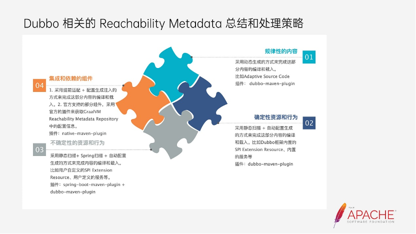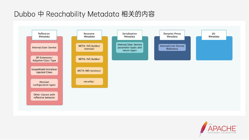 在前面的介绍中多次提到一个词,那就是 Reachability Metadata,Dubbo 在集成GraalVM Native Image 也主要是围绕着 Reachability Metadata 的处理。那么它到底是什么?AOT 也存在自己的局限性,那就是它遵循封闭世界假设原则。也就是需要依赖于能够“看到全部的字节码”才能正确工作,这将导致 AOT 无法支持动态语言的功能,比如 JNI、Java 反射、动态代理、 ClassPath 资源的获取等能力。在 Java 开发过程中,这些 Java 的动态能力被运用在各种场景中,它们早已经是 Java 开发者非常熟练的编码手段。所以 GraalVM 同样也考虑到了这个情况。在既不打破“封闭时间假设”原则的前提下,通过 Reachability Metadata 来解决这类问题。既然需要在编译器中能够确定所有的字节码和资源,那么就让开发者在编码阶段就确定这些元数据信息。这张图中罗列了 Reachability Metadata 目前主要用到五种:分别是与JNI Metadata、Resource Metadata、Dynamic Proxy Metadata、Serialization Metadata、Reflection Metadata。官网上还有上还有第六种 Predefined Classes Metadata,因为它需要配置完整的类字节码 hash 值,它更多是配合 Tracing agent 配使用。对于开发者比较关心的问题就是,如何获取并提供这些 Reachability Metadata,从而达到 Native Executable 成功构建和执行的目的。首先,GraalVM 提供了 Tracing Agent,来辅助开发者在运行时采集对应的Reachability Metadata。但是通过 Tracing Agent 采集的元数据并不能保障能够采集完整,原因是 Tracing Agent 只跟踪和采集执行的代码,而程序输入没有覆盖的代码路径,将无法采集到。GraalVM官网也建议采集后还需要手动 check 元数据。第二个是 GraalVM 提供了 Reachability Metadata Repository,Java 发展这么多年,诞生出了非常多的组件库,业务开发可以非常轻松地使用这些组件来完成业务功能。纯粹的业务逻辑运用到 Java 动态语言特性的场景并不多,反而是这些组件库使用这些特性更加频繁,所以 GraalVM 提供了这 个Reachability Metadata Repository,吸纳来自不同的组件的 Reachability Metadata。举个例子,Netty 是使用较为频繁的网络通信框架,Netty 内部用到了反射。而在这个仓库内,能够找到Netty的Reachability Metadata。那么这个仓库内的 Reachability Metadata 如何才能被应用使用,答案是使用 GraalVM 官方提供的 native-maven-plugin。了解了 Reachability Metadata,与 Dubbo 相关的 Reachability Metadata 有哪些?这张图列举了 Dubbo 对应的一些元数据场景,Dubbo 使用最多的就是反射。第一个场景就是服务,Dubbo 是一个 RPC 框架,定义服务接口是最基本的需求,同时运行时通过反射获取接口的方法等操作非常频繁。这里区分了内外部的服务接口,原因是 Dubbo 框架内还有一些内建的服务,比如 MetricService、MetadataService 等。第二个 SPI Extension 类和 Adaptive 类,我们知道 Dubbo 强大且灵活的扩展性得益于它自有的一套 SPI 机制,其中定义为 SPI 接口的实现类,以及 Adaptive 类都需要用到反射。当然这里的 SPI 扩展实现类,也包含业务自己实现的类,比如大家最熟悉和应用最广泛的 Dubbo 执行链中的 Filter,即使业务有自己的实现类,Dubbo aot 也能扫描到并且加载。第三类是多实例的启动时候需要提前加载一些相关的类。第四类是 Dubbo 核心的配置类,有通过 API 接入的方式使用经验的朋友应该清楚,比如 ServiceConfig、RegistryConfig 等。最后是一些其他反射行为,这里包括的是 Dubbo 依赖的组件,存在一些反射行为,比如 ZK 中有反射。第二种是 Resource Metadata,Dubbo 相关的就以下四个资源文件,META-INF 下的这三个资源文件大家都比较熟悉,我们在使用 Dubbo 的 SPI 时,必须配置扩展实现的配置。才能保证 SPI 的实现被加载到。第四个安全的资源文件, 包含了序列化所需的黑白名单。它能够防范一些序列化的 RCE 漏洞问题,这是 Dubbo3 版本新增的,为了加强服务的安全性。序列化相关的 Metadata。与 Dubbo 相关的主要是内外部服务方法的返回类型和请求参数类型。Dubbo 作为一个 RPC 框架,基本能力就是实现 RPC 调用。在调用过程中无论是请求还是响应,都需要被序列化和反序列化。第四个就是到动态代理的元数据,在 Dubbo 中主要是在 Consumer 需要有生成动态代理类,用于代理远程的服务接口。屏蔽掉一些网络传输、序列化等行为的细节,让调用方能够像本地方法调用一样使用。而最后一个 JNI 目前 Dubbo 内还没有相关的元数据信息。这是 Dubbo 相关的 Reachability Metadata 总结和处理策略,我们把它分为了四类。1. 规律性的内容:是具备一定规律且需要被可生成的内容,比如刚刚提到的 Adaptive Source Code 的生成。