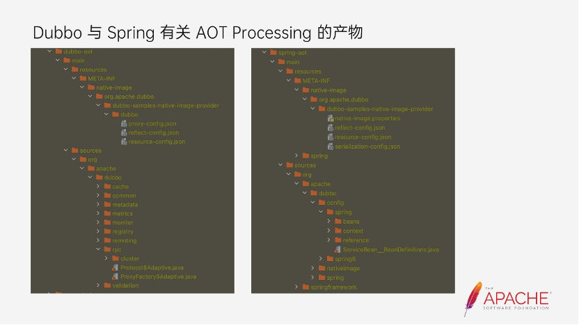 Spring 和 Dubbo 都有自己的 AOT 处理逻辑,但是它们之间的处理又有些不同,这是 Spring Aot 的处理逻辑,可以看到从源码编译开始,Spring 会直接从 main 函数启动应用程序,并且会将 Spring bean 生成的 source code 生成,以及对应的 Reachability Metadata 生成。对于 Spring 而言,在启动和扫描过程已经能够完成所有 Metadata 的扫描。下面这个就是通过 Spring AOT 生成的 Bean Source code,当我们简单的用一个 Spring 的 Service 注解时。这个 DemoService 的实现类就被定义为一个 Spring 内的 Bean,而经过 AOT 处理后,会生成右边这个与 DemoService 有个的 BeanDefinition 的提供类。用于在加载 Bean 时候获取相关的信息。而 Dubbo 的 AOT 则是在源码开始编译后,会启动一个扫描的进程,来完成刚刚列举的与 Dubbo 有关的 Reachability Metadata 和对应的 Source code。可以看到,我们将 Spring 的 Service 注解换成 Dubbo 的 DubboService 注解后,同样也会得到一个与 DemoService 有个的 BeanDefinition 的提供类,但是里面的内容是 Dubbo 提供的。包括拼接 interface 等参数。这里就是 Spring AOT 处理和 Dubbo AOT 的处理结果,可以看到分别在 spring-aot 和 dubbo-aot 下生成了 GraalVM 所需的 Reachability Metadata,以及他们各自的 Source code。上图是 Spring 本身提供的一个产物的内容以及 Dubbo 的 AOT 产物的内容。可以看到 Dubbo 下面是 Adaptive 的一些 source code。最后 Native 在执行的时候会读取到这里所有的配置。这是后续 Dubbo 在 AOT 演进上与 Spring AOT 的边界,首先在 API 接入的方式中,Dubbo 不依赖于 Spring,所以它能够完成所有的内容,包括所需的 Adaptive Source code 和 Reachability Metadata。其次因为 XML 和注解都依赖于 Spring,所以 Dubbo 内的 Bean 都将会依托于 Spring AOT 的能力来实现,包括 ServiceBean、ReferenceBean 以及 Dubbo 框架内的与 Spring Bean 有关的内容。除此之外,Spring 也会生成所需的 Reachability Metadata。Dubbo 在 Native