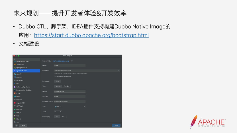第一点就是提升开发者体验和开发效率。Dubbo 在 3.0 之后提供了 CTL、脚手架、IDEA 插件,Dubbo Native Image 目前还在建设中,之后也会将 Native Image 加入其中。此外,还有关于一些 Dubbo Native 的文档建设也会逐步开展。第二点是性能优化和提升。在 GraalVM 提供的能力上,我们还可以把一些类相关的可达性的配置加上去,产生作用之后能让最后打出来的二进制包更小,编译时间更短。第三点则是覆盖更多的组件。因为目前很多组件都还不支持,所以我们现在的主要思路是把 Dubbo 主仓库的扩展性支持完成,然后再往 dubbo-spi-exntensions 的扩展上做相应的支持。另外,内核所需要的可达性的元数据,我们会把它推到 GraalVM 的可达性的元数据的仓库上面去,让业务开发能够正常使用 Dubbo 内核所需的元数据信息。最后是我们覆盖更多组件的思路:我们会优先考虑 GraalVM 官方的支持,但是因为 GraalVM 发布周期不可控,推进的时间可能也会比较长,所以我们也会为一些通用且必要的组件优先支持元数据,让 Dubbo 用户能够提前享受到 Native Image 所带来的技术红利。