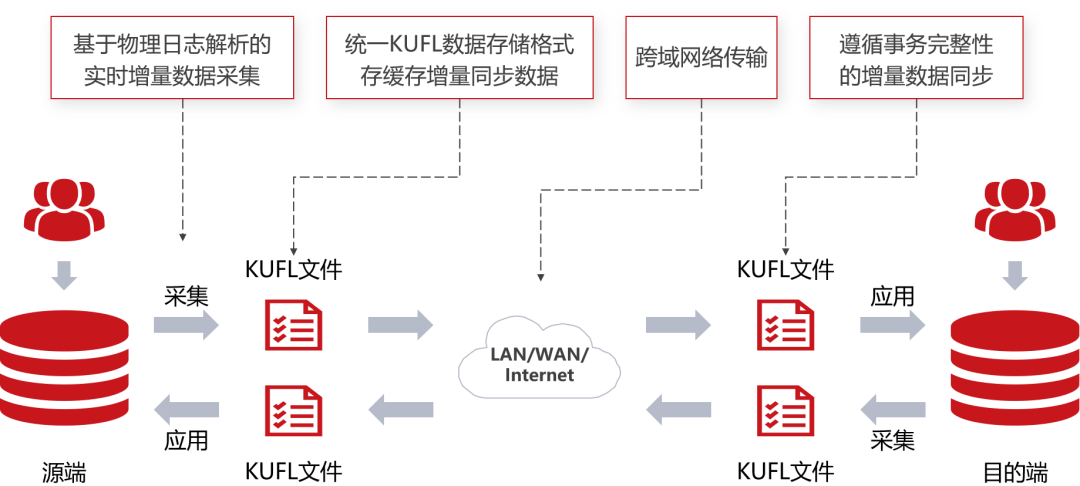 KFS的主要角色分为源端和目标端,其中源端连接源数据库,通过实时采集数据库的日志信息并解析处理,统一成以KUFL数据存储格式的物理文件。目标端通过网络连接到源端,不断获取由源端产生的KUFL文件,解析以后由目标端连接目标数据库,以遵循事务完整性的原则将数据写入到目标数据库中。而转换器可配置在采集阶段或者应用阶段,以适应不同的数据转换处理场景。