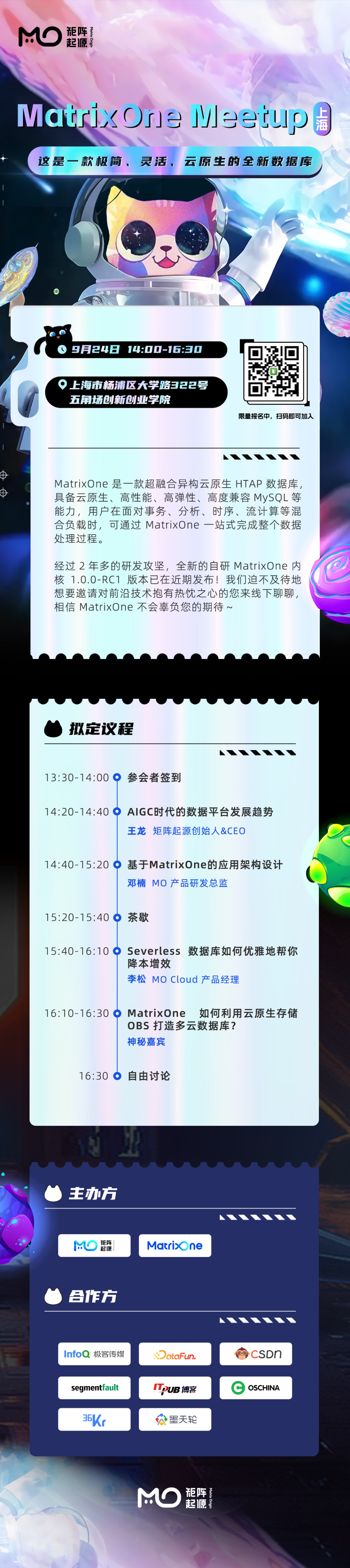 与业内大咖面对面交流技术 品种丰富的美味茶歇应有尽有 MatrixOne 定制卫衣、水杯、书包、T恤等多重好礼