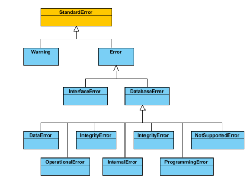 接口将所有异常处理类全部封装到了 GBaseError.py 文件中,所以当引用 这些异常类时需引用 GBaseError.py 文件。所有的错误、异常、警告等内容的 错误处理全部经由此文件中的类完成。下图为所有异常类继承关系图。