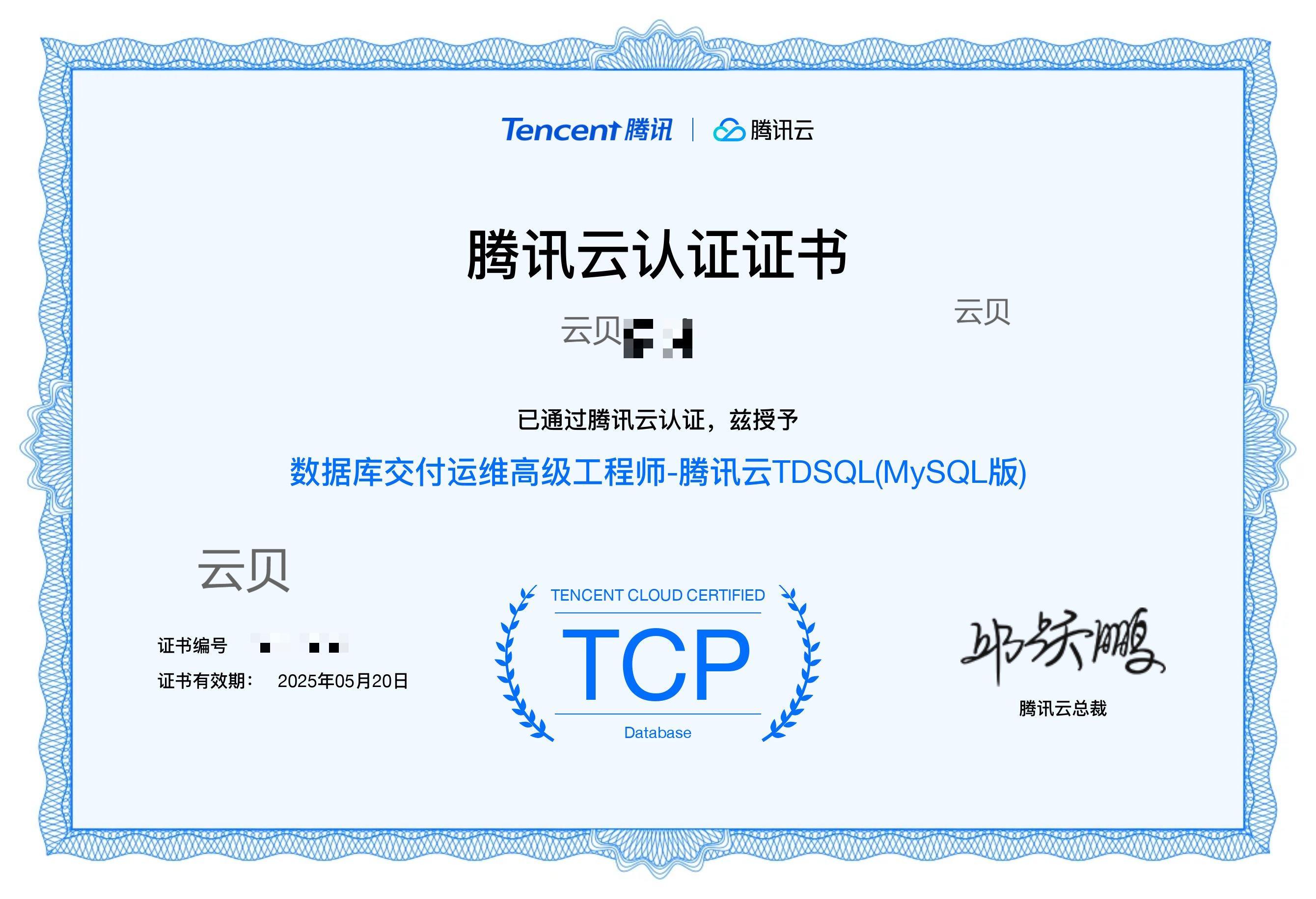 「专家级」云贝腾讯云数据库TCE认证考试及证书TDSQL for MySQL版