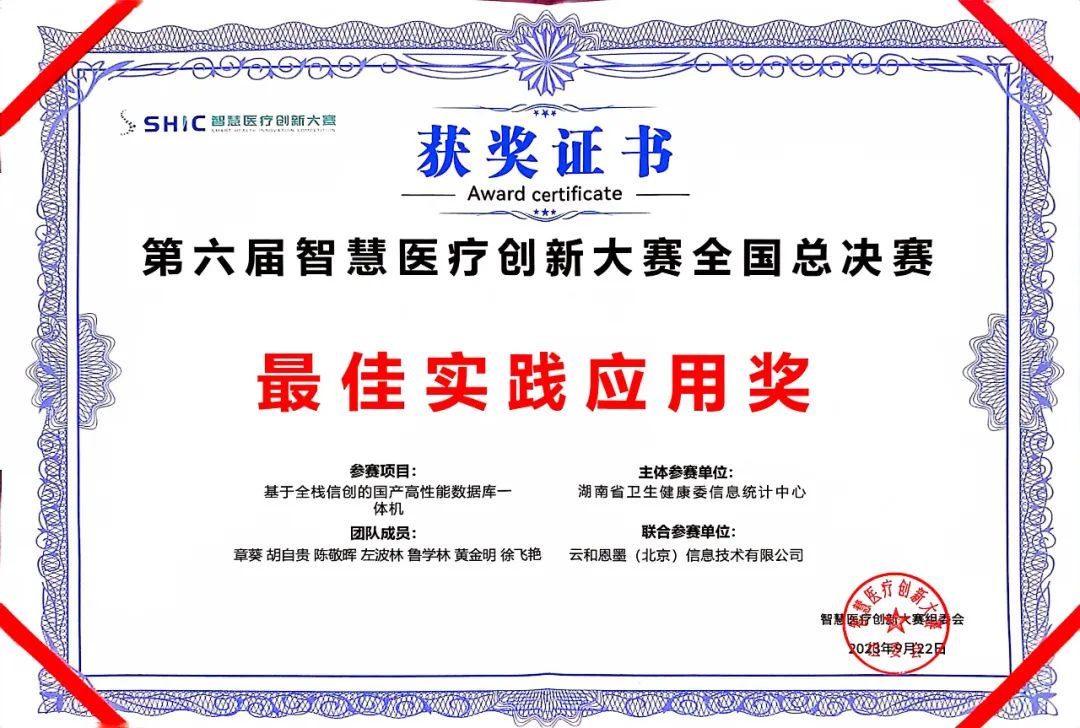 大会期间,“科创中国”技术路演--智慧医疗专场暨第六届智慧医疗创新大赛全国总决赛入围项目路演如火如荼地开展。云和恩墨联合湖南省卫生健康委信息统计中心申报的参赛项目《基于全栈信创的国产高性能数据库一体机》,作为湖南省赛区选送的优秀项目之一,一路“披荆斩棘”,在总决赛中从200多个全国优秀的参赛项目中脱颖而出,成功斩获“医疗信创赛道一等奖”和“最佳实践应用奖”,充分展示了云和恩墨在智慧医疗领域的创新能力和技术实力。公司未来将持续助力国产化,成为各行各业数字化转型升级的最强底座。
