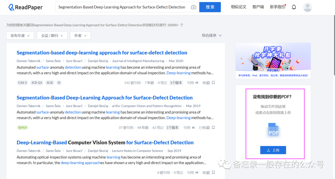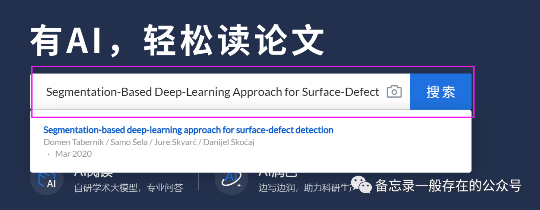 登录好了之后呢,你可以在这里面找论文,比如搜一个“Segmentation-Based Deep-Learning Approach for Surface-Defect Detection”嘛: