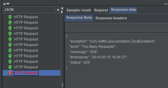 @Overridepublic Object run() {RequestContext ctx = RequestContext.getCurrentContext();Object obj = ctx.getThrowable();if (obj != null && obj instanceof ZuulException) {ctx.remove("throwable");}//我自定义的Json对象:ResponseResponse responseDto = new Response<>(ResultCode.ERROR);try {ctx.setResponseBody(objectMapper.writeValueAsString(responseDto));} catch (JsonProcessingException e) {log.error(e.getMessage(), e);}ctx.setResponseStatusCode(429);ctx.setSendZuulResponse(false);return null;}}