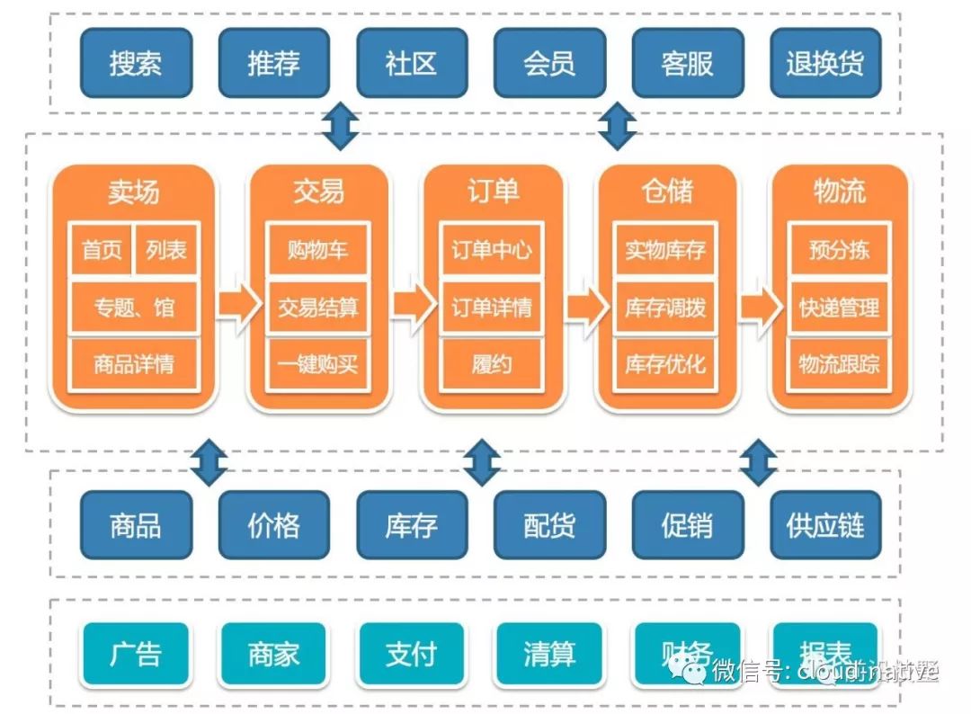 互联网应用的业务特征决定它和企业级应用不同,主要有以下几个问题存在:海量用户、产品迭代迅速、7*24不间断服务、流量突增、业务组合复杂。以上述最后一点为例,电商业务系统架构非常复杂,一个粗略的示意图如下。