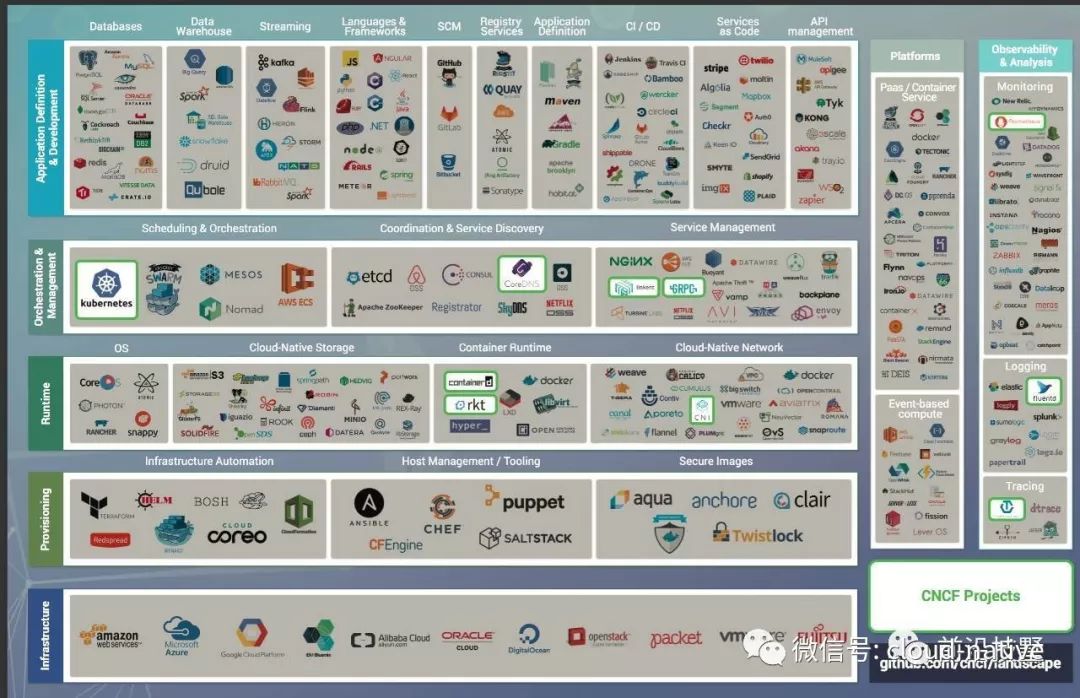 CNCF目前所涵盖的项目包括Kubernetes、CoreDNS、Linkerd、gRPC、Containerd、rkt、CNI、Prometheus、fluentd和OpenTracing。这其中既有Kubernetes、gRPC、Prometheus这样的优秀产品,也有CNI、OpenTracing这样的标准协议。CNCF的发力也主要集中在编排与治理层、运行层和观察与分析三部分。