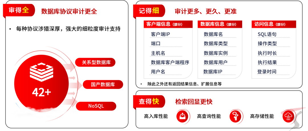 天融信数据库审计与防护系统通过数据库协议自动识别技术及精确细粒度解析功能,支持国内外40余种主流数据库协议,包括国产化和非国产化数据库的关系型、非关系型(大数据类)数据库协议。此外,该系统结合灵活的审计策略,可实现对数据库操作的全面审计。审计字段包括源目IP、实名用户、数据库名、SQL语句、返回码等70多个维度,审计粒度细、维度多,可详细记录数据库操作行为,同时可以将审计到的日志发送至数据安全管控平台进行风险分析,形成数据安全事件溯源闭环。