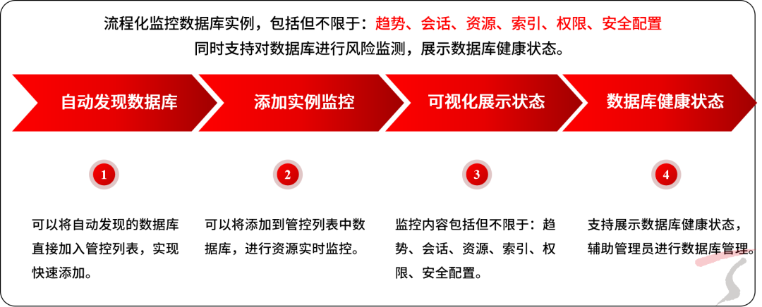天融信数据库审计与防护系统通过自动发现技术梳理数据库实例,无需人工干预即可帮助用户梳理现网实例资产,并监控实例表空间、缓冲区、锁情况等基本信息,统计分析实例相关安全事件,以及慢SQL、错误SQL等异常情况。该系统能够减少人工干预,综合评估资产的健康状况,帮助用户真正做到重要资产心中有数。
