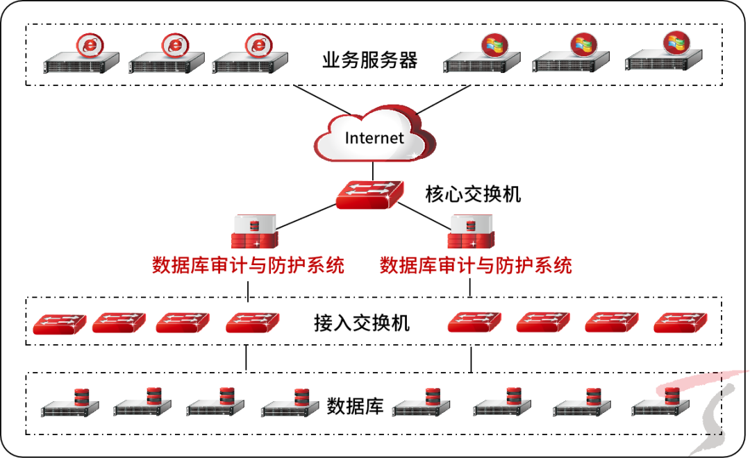 基于安全需求,可分别在互联网区、大数据平台区、服务器区和测试开发区等区域部署天融信数据库审计与防护系统,通过制定高效的防护策略,实现指定访问数据库的数据对象,并对库、表进行权限控制,对高危操作、SQL注入、异常登录等风险行为及时告警或阻断,从而满足客户实时监控数据库、保证资产健康的需求。