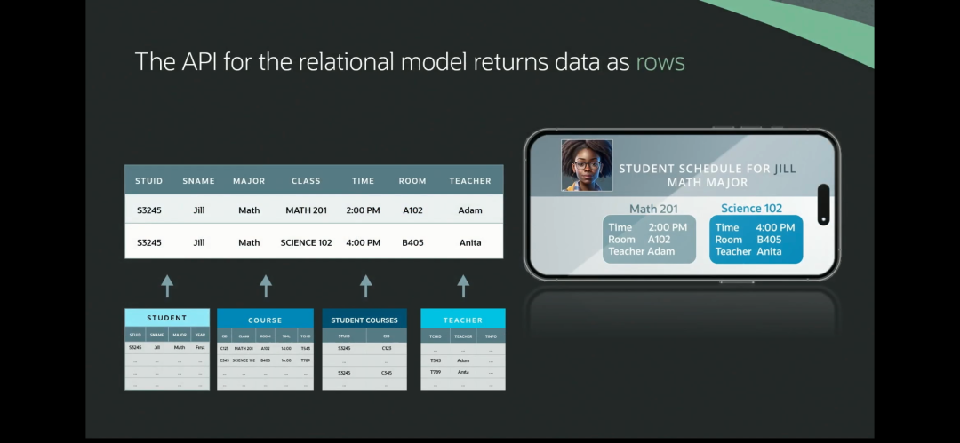 举一个学生课程注册系统的例子,如果使用关系模型,需要设计4张表,数据访问的API实际上是表中的行,数据的获取需要通过复杂的表联接实现。