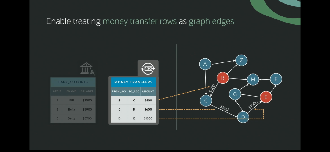 不止于此,除了JSON二元性,Oracle又新增了Graph二元性。以一个金融应用为例,关系数据库中描述银行账户的行可以转换为Graph中的顶点,而描述转账的行则可以转化为Graph中的边。通过简单的定义,应用开发者可以方便地查看资金的流向或对数据进行更新。