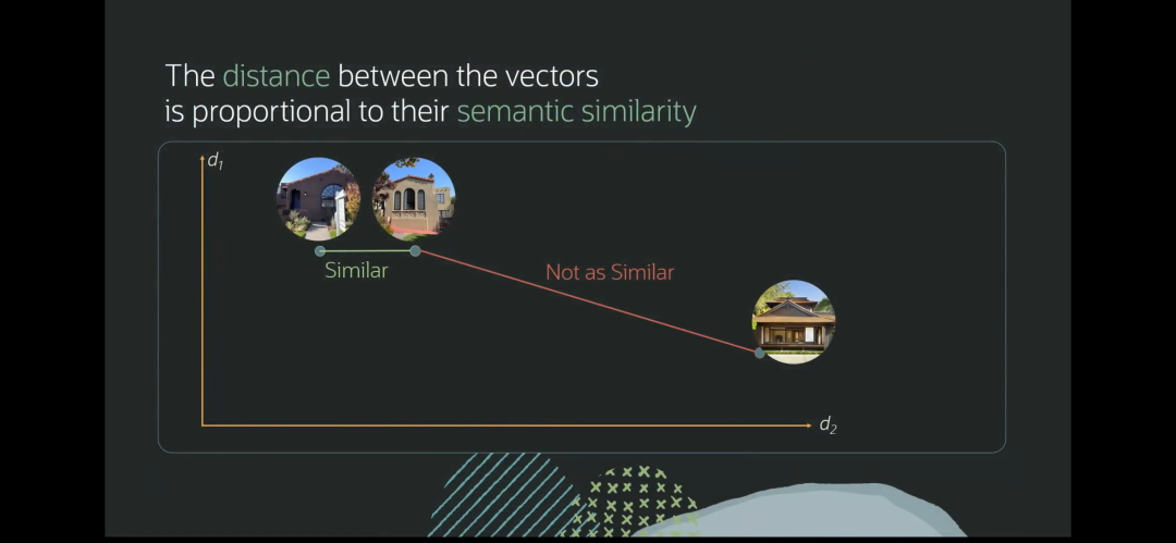 向量之间的距离表示了语义的相似度。为了容易理解,我们只取2个特征。通过距离,我们可以很直观地看到两栋房子是非常相似,还是完全不同。