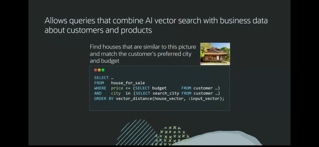 Oracle数据库23c已经支持AI向量搜索,与业务数据结合,可以使搜索的结果更加准确,详细的介绍可参见“走进 OCW | Oracle 推出集成向量数据库”。不止于此,Oracle还利用自身的技术积累和创新为向量处理技术赋能,包括向量索引和分区提升查询速度,RAC提升可扩展性和可用性,Exadata透明的卸载操作到存储层以提升搜索性能,Sharding实现数据主权,还有安全性,灾备,事务一致性,并行SQL,分析型视图等。