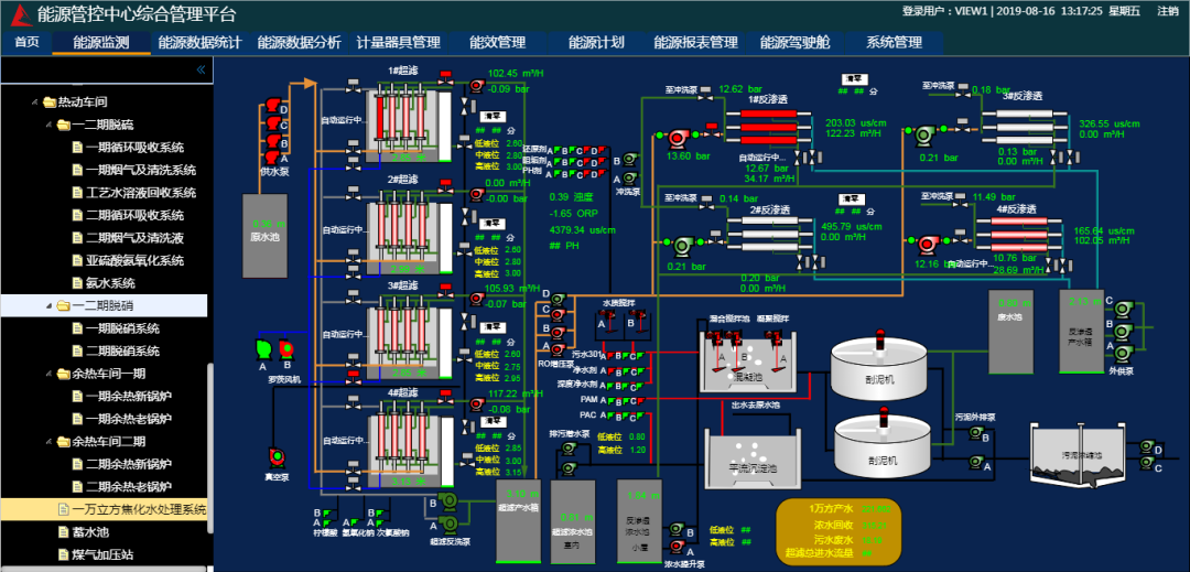 能源过程可视化:通过清晰明确的看到全厂当前生产状况和物料走向,对全厂的生产状况实时掌握,帮助管理人员了解能源全厂、各个车间、产线都消耗了多少,实时监测各能源计量表的各项参数。