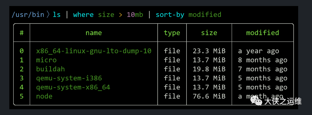 Nu Shell 的强大之处在于管道操作。您可以将多个命令连接在一起,以实现复杂的数据处理任务。以下是一个示例,演示如何使用 Nu Shell 查找目录中的特定文件: