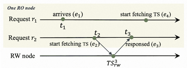 RO在处理读请求时,必须获取RW节点的最新时间戳。如果RO节点的负载很重,一方面会占用更多的网络带宽,另一方面会给RO的请求带来更大的延迟。而通过设计线性Larmport时间戳,可以在高并发时让一个时间戳服务多个请求。其核心思想是,如果一个请求发现在其到达时间之后已经有其他请求从RW获取了一个时间戳,那么它可以直接重用该时间戳,而不需要再向RW获取一个新的时间戳,这样仍然可以保证强一致性。可以用下面的例子来证明。