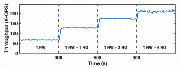 PolarDB-SCC可以通过代理提供一个统一的强一致的endpoint。用户可以将应用连接到该endpoint,并在后端动态增加或减少RO节点的数量,而无需对应用进行任何更改。PolarDB的Serverless功能能够针对动态的工作负载动态调整RO节点的数量。与PolarDB-SCC集成后,应用程序看起来像是只连接到一个拥有动态资源的RW节点,同时保证了强一致性。下图中测试了这种场景。在该测试中,工作负载在300秒、600秒和900秒时变得更重,数据库集群会在后台动态添加更多RO节点,当集群中添加更多RO节点时,性能会以几乎线性的方式迅速提高。